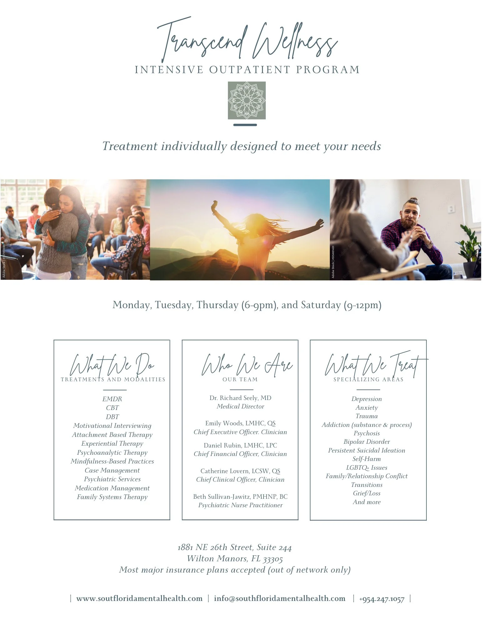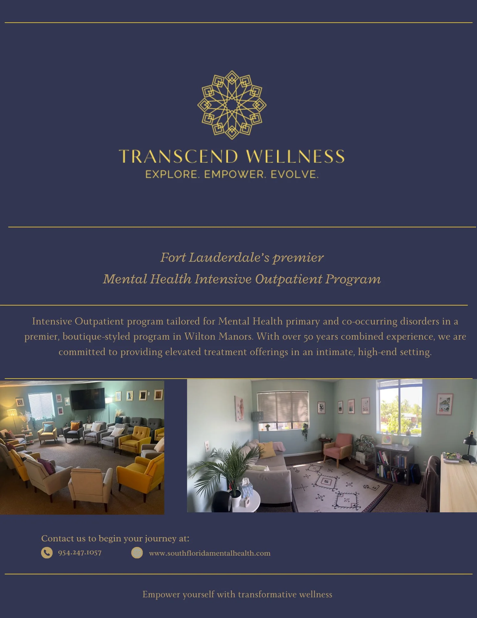 Transcend Wellness is an intimate, boutique style, family-owned intensive outpatient program in Wilton Manors, Florida. Our program was created when three experienced therapists consistently struggled to find the treatment options and support for their patients. From this need, Daniel Rubin, LMHC, Catherine Lovern LCSW, and Emily Woods, LMHC decided to design and build a top of the line, clinically driven and tailored IOP treatment program. Transcend Wellness accepts most major insurance plans (out of network only).